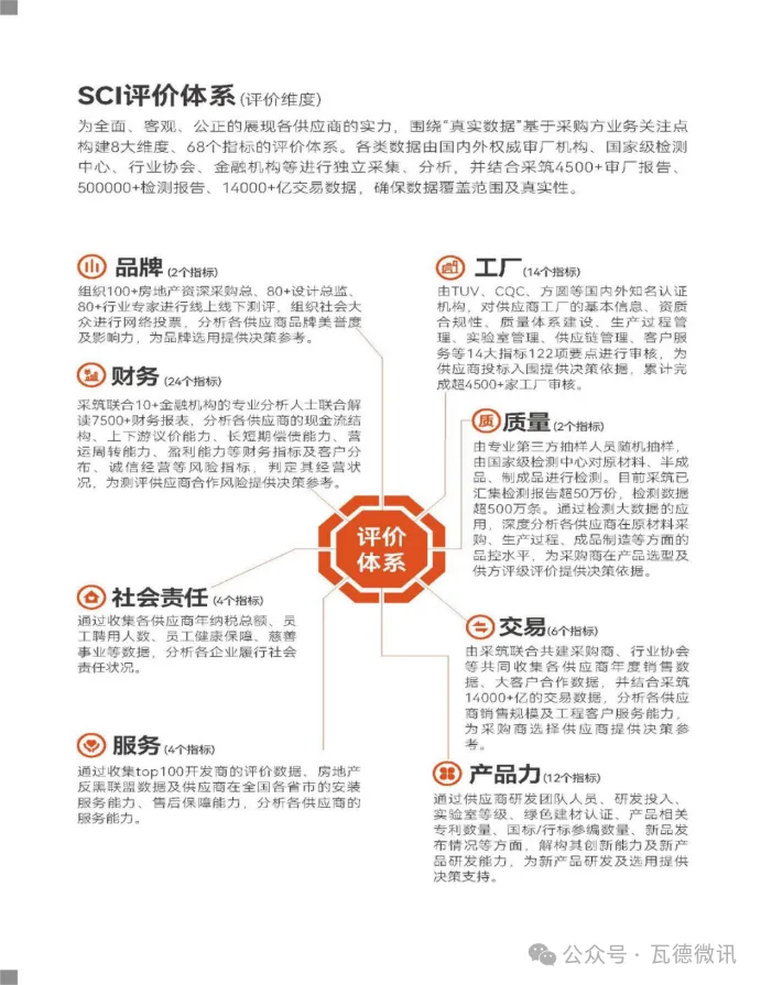 2024年,采筑供應(yīng)商綜合指數(shù)SCI全面升級:1、測評模型優(yōu)化:新增了政府平臺、國央企采購商關(guān)注的綠色工廠、綠色建材、綠色供應(yīng)鏈等測評指標(biāo);2、測評范圍擴(kuò)大:本次測評涵蓋91個品類,2600多家供應(yīng)商參評,測評的供應(yīng)商數(shù)量增加50%,測評范圍也從供應(yīng)商擴(kuò)展到與之相關(guān)的經(jīng)銷商、安裝商;3、升級并開放SCI智能測評系統(tǒng):可支持采購方自由選擇關(guān)注的指標(biāo)及算分規(guī)則,為客戶提供根據(jù)自身需求定制的評估模型,快速生成評分;4、采信范圍擴(kuò)大:采筑聯(lián)采資信標(biāo)采信SCI測評得分,更多的采購商客戶通過采信SCI測評數(shù)據(jù)進(jìn)行品牌庫建設(shè)。二、SCI三大特點(diǎn):無濾鏡、無雜質(zhì)、無廣告SCI評價資料真實(shí)。測評資料來自房地產(chǎn)商、設(shè)計院、建筑單位、檢測機(jī)構(gòu)、金融機(jī)構(gòu)、供應(yīng)商、第三方數(shù)據(jù)平臺等渠道,覆蓋整個產(chǎn)業(yè)鏈。SCI基于評價模型對資料進(jìn)行比對和甄別,提升資料的真實(shí)可靠性。SCI評價數(shù)據(jù)豐富。4500多份供應(yīng)商審廠報告、50萬余份產(chǎn)品檢測報告、7500余份財務(wù)報表,200多家共建單位線上線下專項(xiàng)測評、上萬大眾參與投票。三、全行業(yè)強(qiáng)推,SCI勢不可擋采筑將SCI評價內(nèi)容與行業(yè)權(quán)威機(jī)構(gòu)的供應(yīng)鏈管理成果充分結(jié)合,輸出2024《采筑建材行業(yè)指南》,為行業(yè)提供一份客觀公正,能快速摸清產(chǎn)品力風(fēng)向,全方位了解供應(yīng)商實(shí)力的供采合作指導(dǎo)工具書,輔助采購商客戶準(zhǔn)確、快速決策,佐證供應(yīng)商綜合實(shí)力。